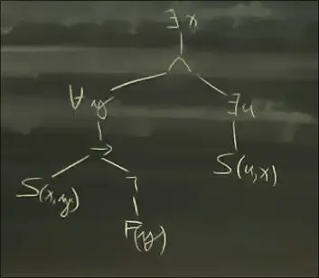 For F=∃x(∀y(S(x,y)→¬F(y))∧∃uS(u,x))