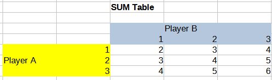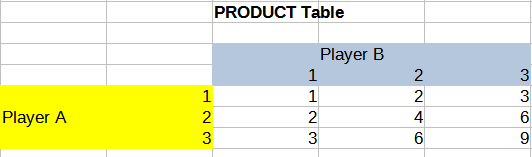 In the example of the Product sum game, the rules are, Player A and Player B have 3 numbers to choose from: {1,2,3}. If the sum of Player A’s number and Player B’s number is greater than the product of both, then Player A gains a point If the product of Player A’s number and Player B’s number is greater than the sum of both, then Player B gains a point