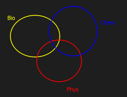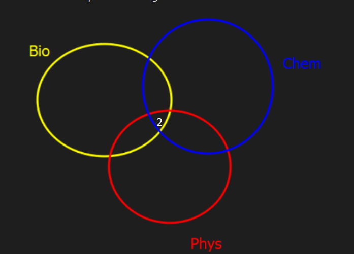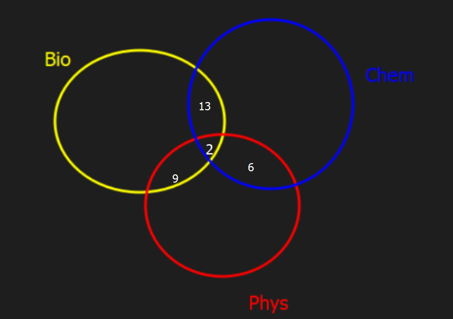 Then, the second intersections. 15 take both bio and chem, 15 -2 = 13. do same for others.