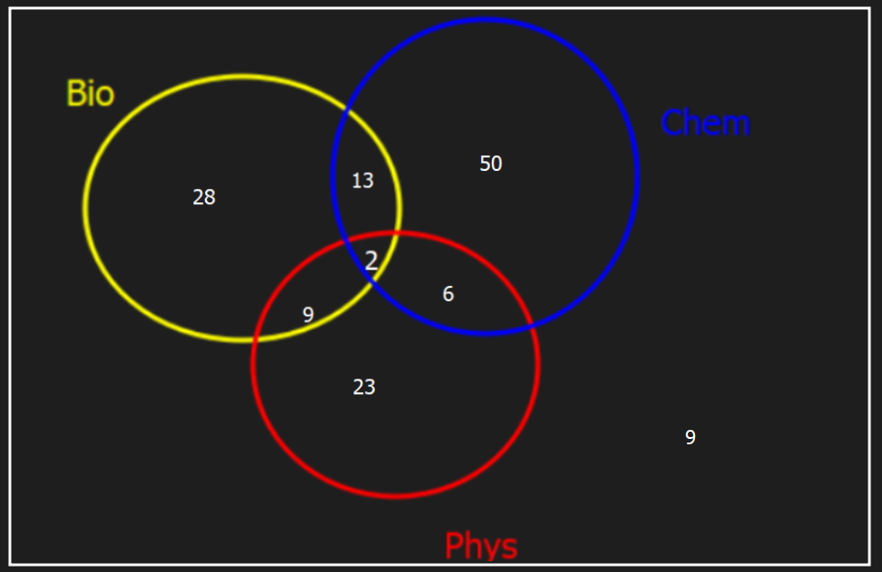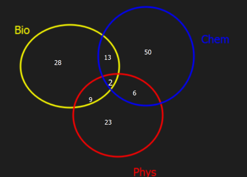 Lastly, there are 52 for bio, 52 - 9 - 13 - 2= 28. same for others too.