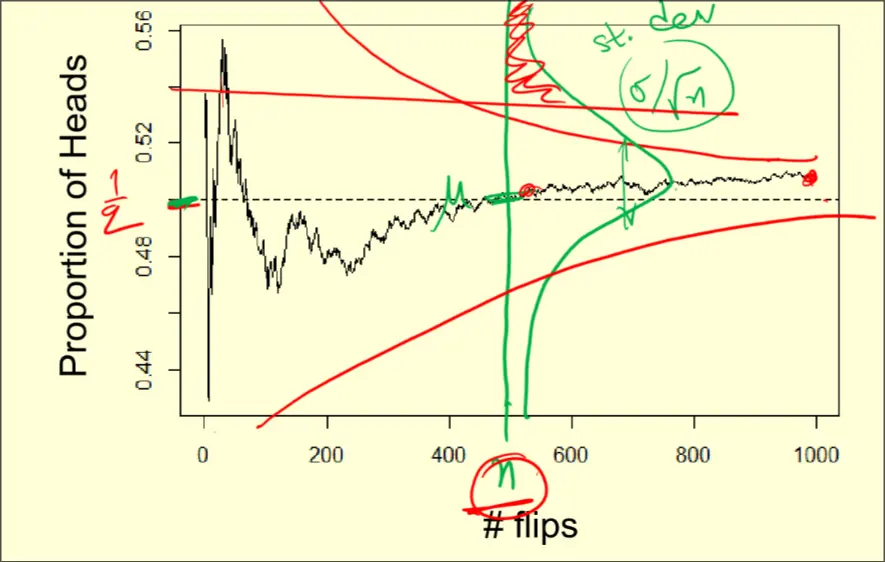 We want to say the difference between out sample mean from the theoretical mean to be within , so the odds that they are outside will approach 0 as the number of trials increases to infinity.