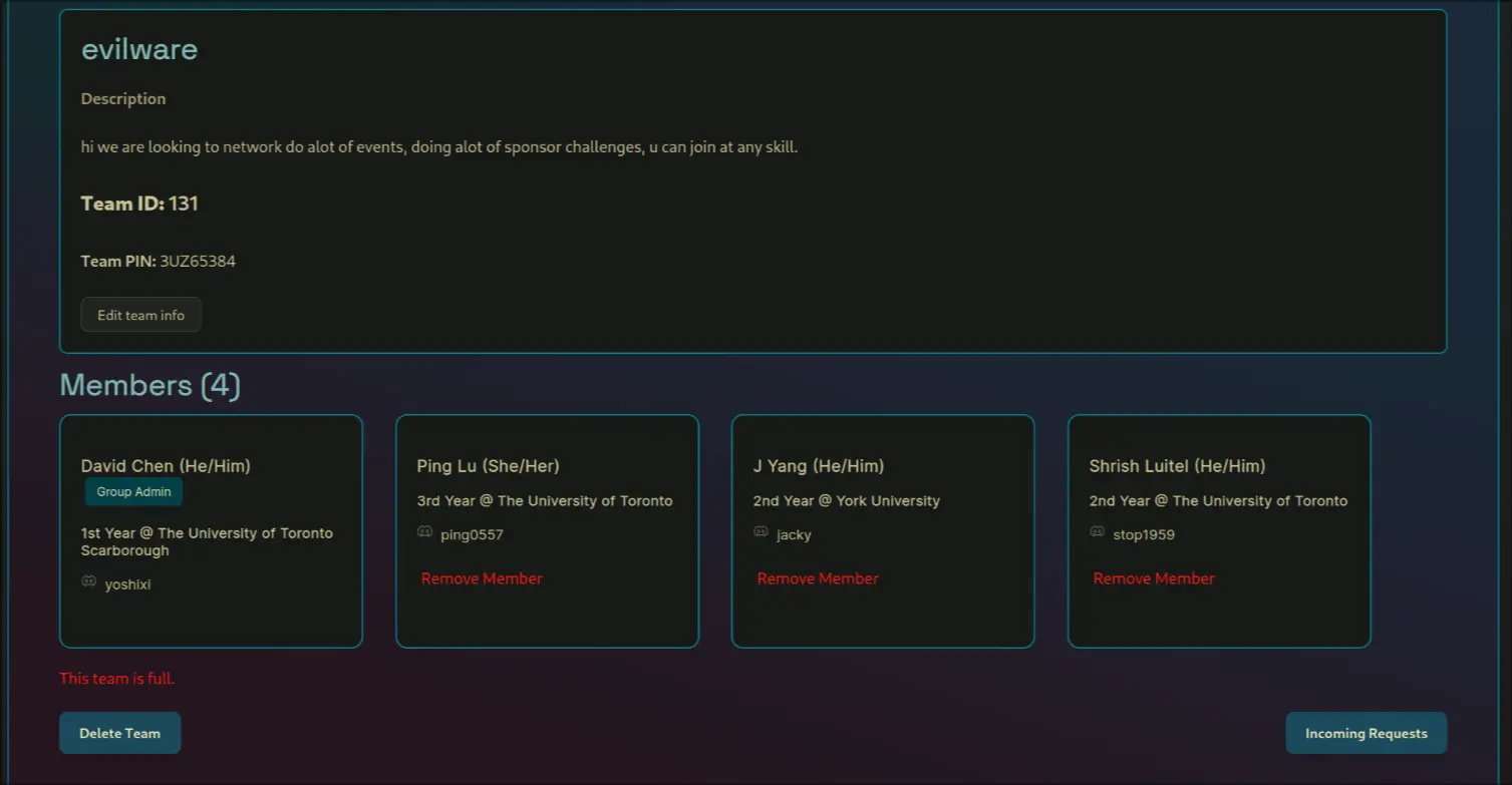 - Met 3 ppl. took so long to find the last member, its so weird most ppl are in teams of 3/4, hard to find others that are indivudual. Admittedly, I was finding people in person, searching online wouldve been easier I suppose