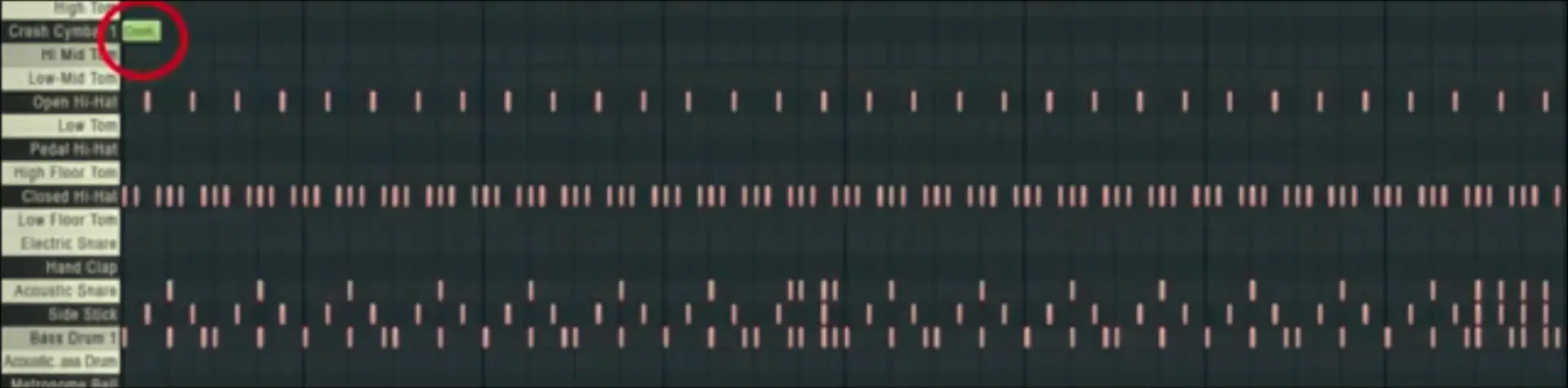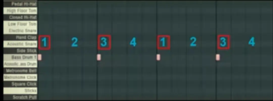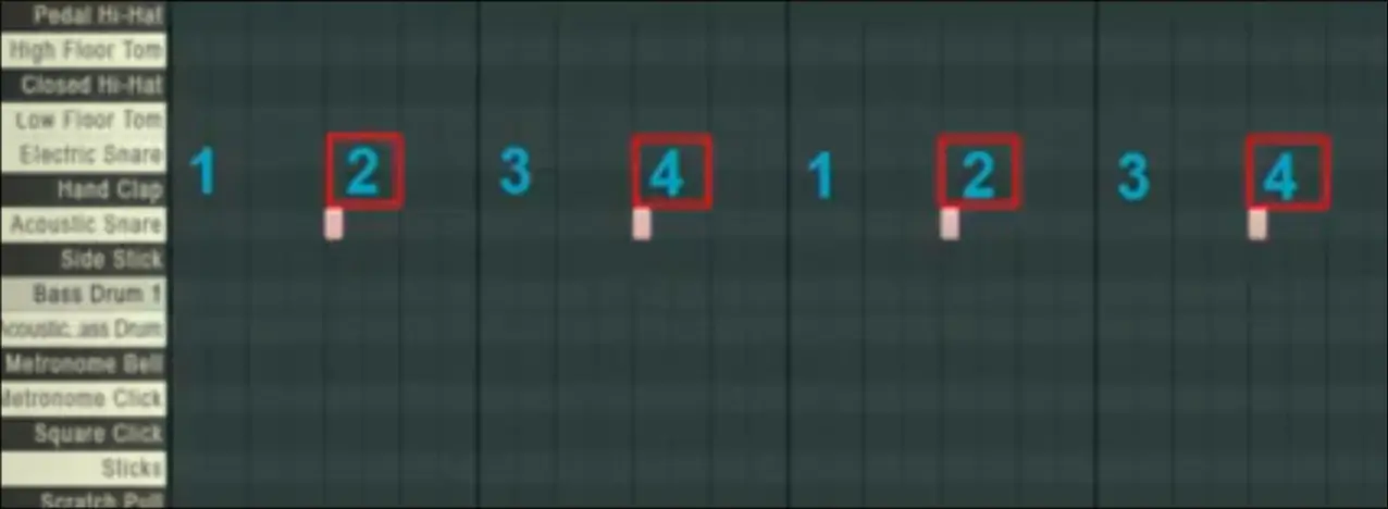 Snare Drum and Open Hi Hats are often on the 2nd and 3rd beats