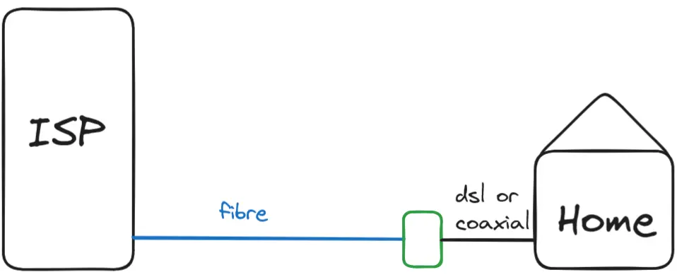 Fibre optic cable is connected from your Internet Service Provider to a box in your neighbourhod. The box connects a DSL or Coaxial Cable to your house