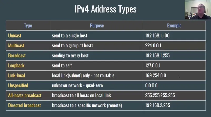32bit address comprised of 4 sets of 8-bit binary numbers (octets) or 4 sets of 3 digit decimal numbers. *.*.*.* Reserved IPs (Class C) 127.*.*.* Loopback Cannot have a Host ID of 0 Cannot have a Host ID of 255 Assigned IPv4 Automatic Private IP Addressing Concepts ARP