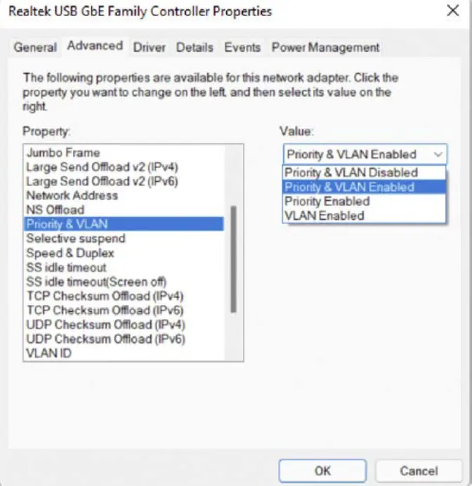 Change Adapter Settings > Right click NIC and Properties > Configure > Advanced > Priority & VLAN > Priority & VLAN Enabled