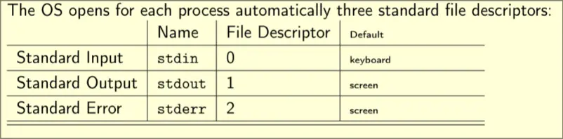Handles to access a file or input output resource. stdin stdout stderr Default Opened File Descriptors When a program runs, all three file descriptors are open Related Functions memfd_create()