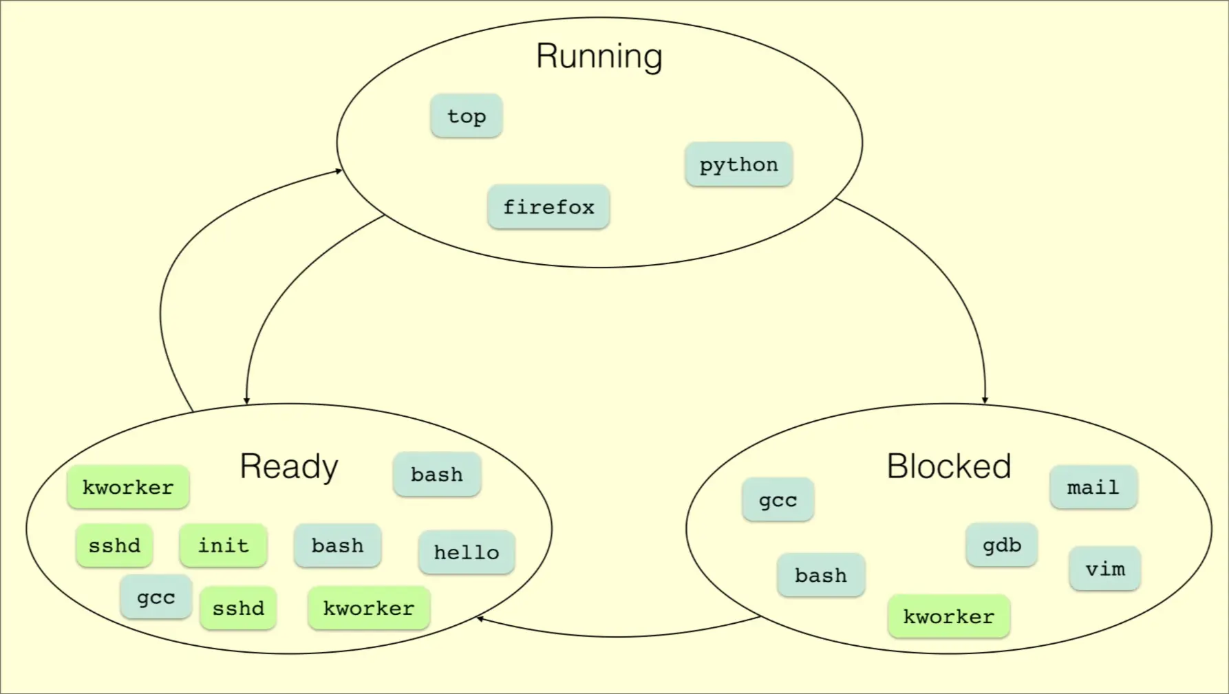 - GCC can be be running, wants to access a file but its being used, becomes blocked while it waits
