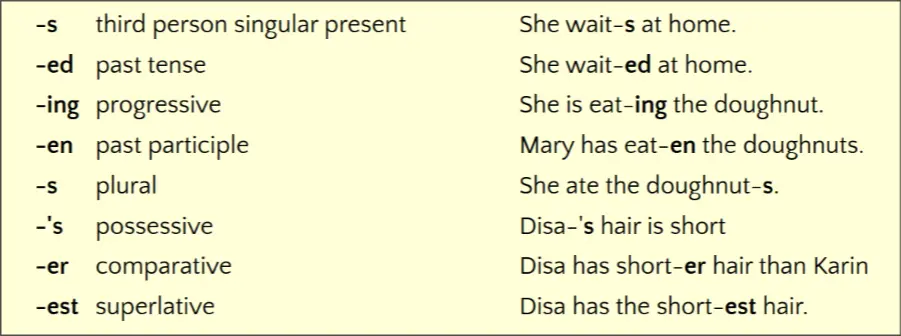 A form of Inflection wherein Morphemes Affix to the end of the word.