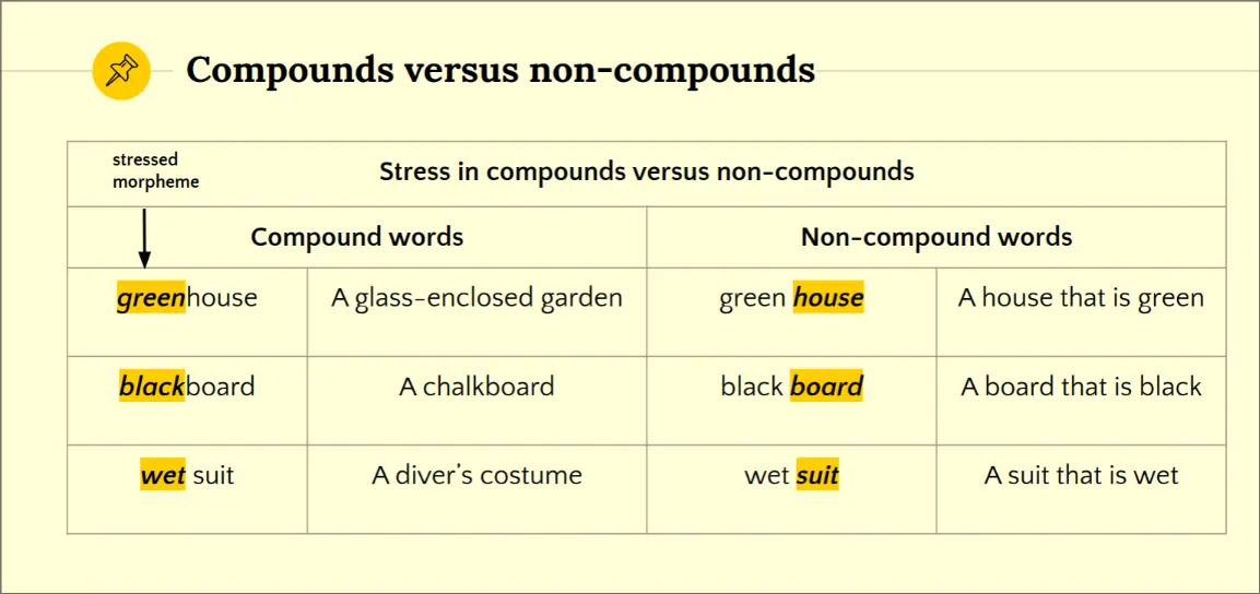 - Adjective-Noun Combinations have more prominent stress on the left-most element