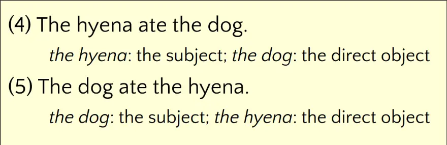 These are the relationship between grammatical entities. Subject Direct Object Indirect Object Examples