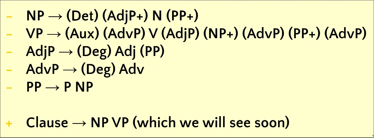 These are rules that organize Word into Morphological Tree. Rules Heads are obligatory Specific Phrase PSRs Outlines: Noun Phrase Verb Phrase Adjective Phrase Adverb Phrase Prepositional Phrase Clause