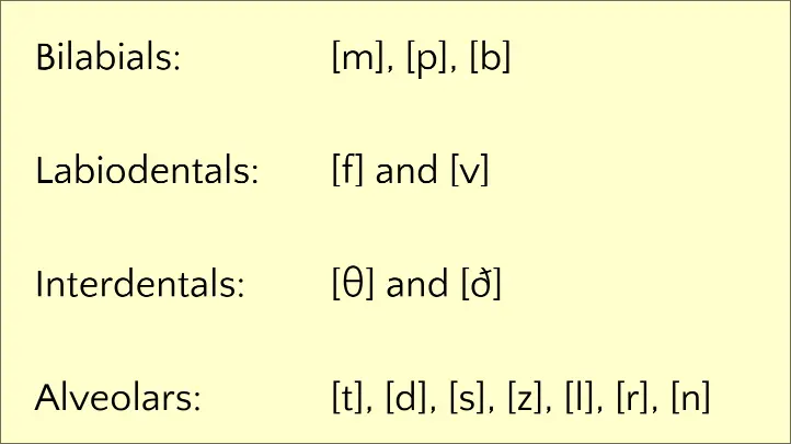 These are areas where articulation of Consonants are based. Mostly with the tongue and the lips. Places Labial Sounds Bilabial Sounds Labiodental Sounds Interdental Sounds Alveolar Sounds Nasal Sounds Liquid Sounds Alveopalatal Sounds Palatals Sounds Velar Sounds Labio-Velar Sounds Glottal Sounds