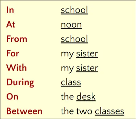 Indicating locations, space or directions. Must be followed by a Noun Sometimes follows an Adjective List of `About `on in at from for with during between