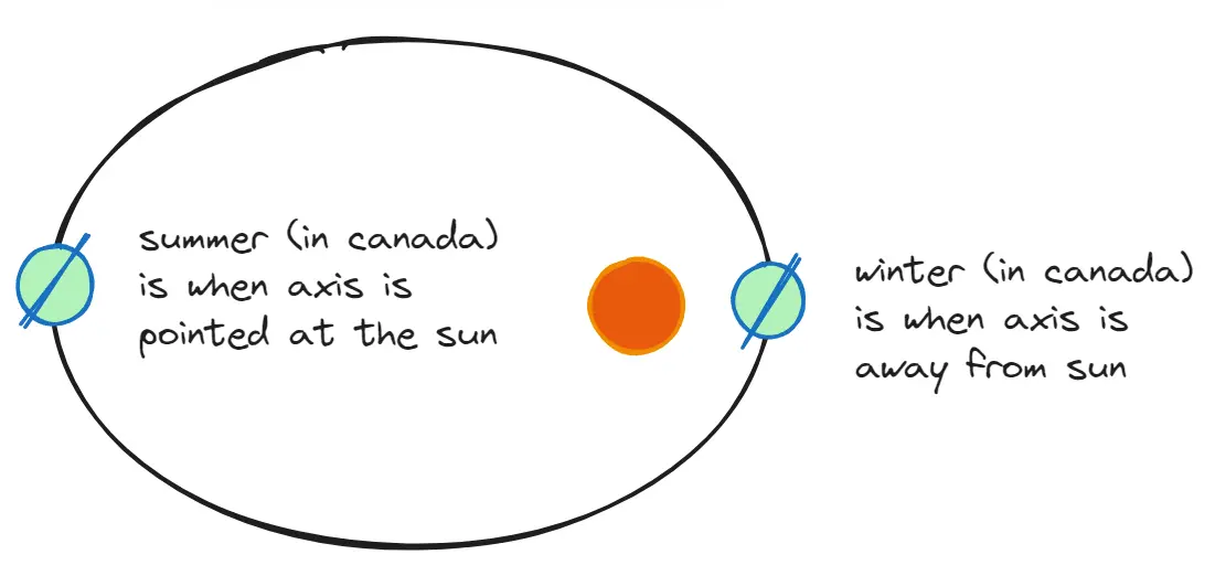 As the earth goes around the sun, there is a rotational axis. The axis, is at a slight angle.