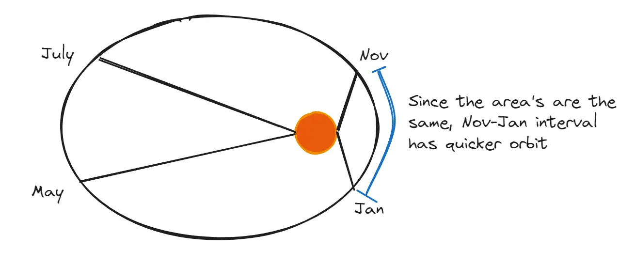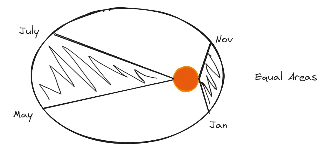 Kepler’s second law states that the time intervals - say July-May, and another time interval Jan - Nov have the same area.