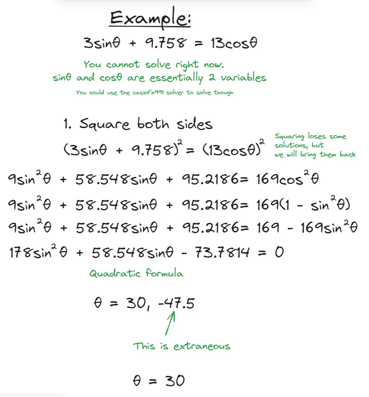 You are solving these equations. Where n,a,m are given. You must square, convert cos to sin, then quadratic formula it.