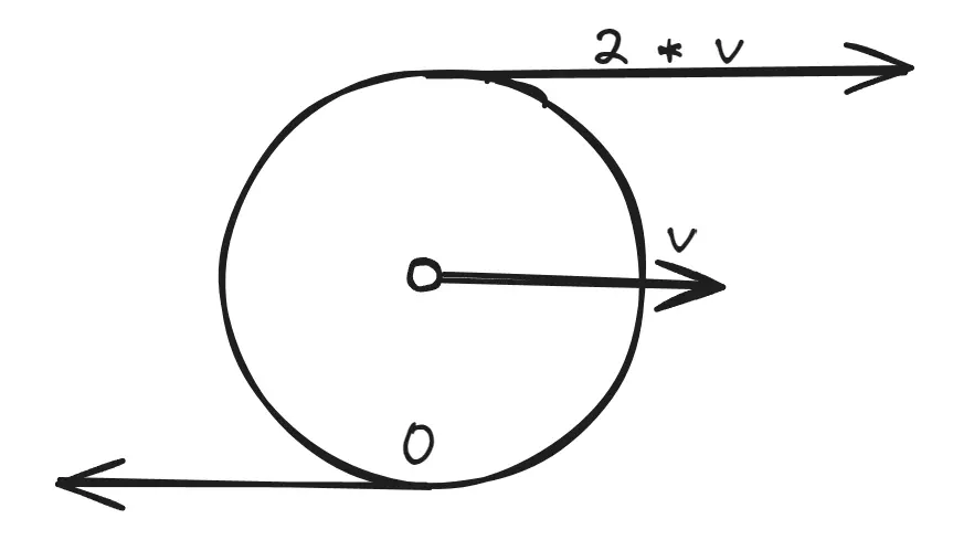 When a wheel is moving, the top part is actually twice as fast as the wheel and the bottom of the wheel has a velocity of 0.