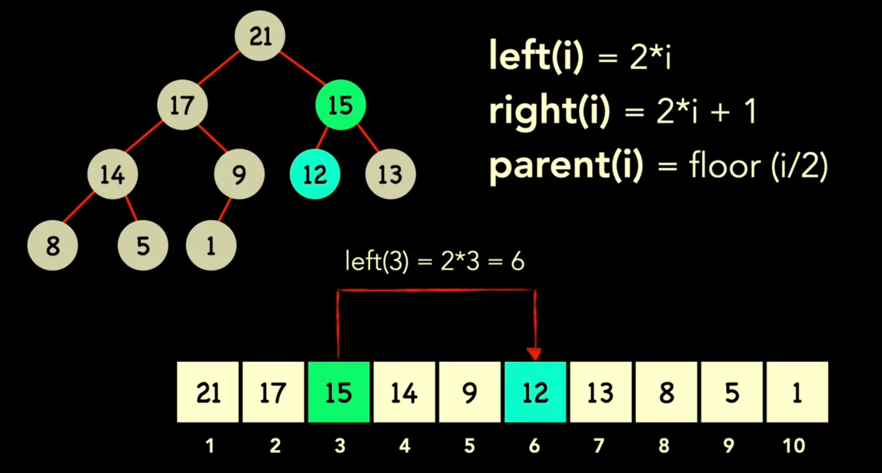 A Binary Tree can be converted to an Array with the following formulas to find index: left(i)=2∗i right(i)=2∗i+1 parent(i)=⌊(2i)⌋