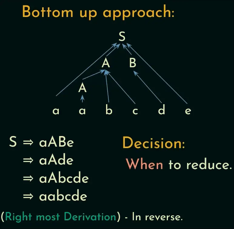 Starting with the final input result, then working backwards to achieve the root node, choosing when to flip Production Rules to reverse derivations