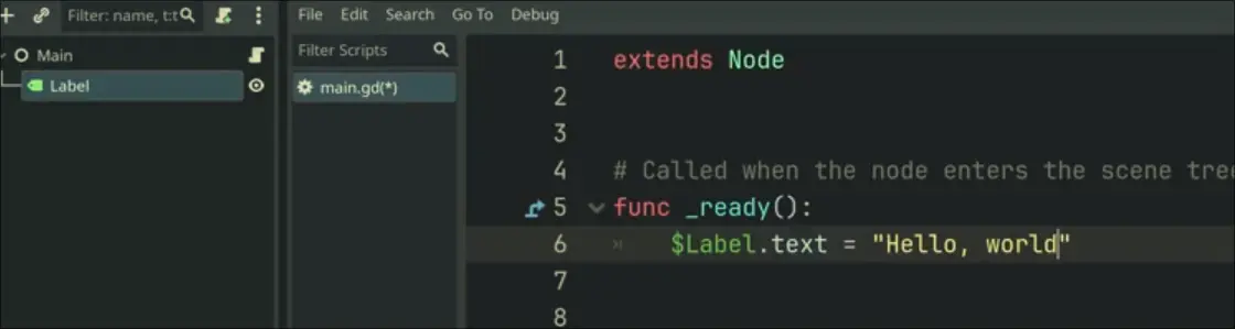 Onready Example extends Node # onready ensures that all child nodes are created @onready var weapon = $Player/Weapon func _ready(): print(weapon.get_path()) Direct Reference Example func _ready(): $Label.text = "Hello World"