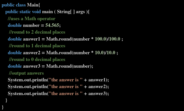 using the .round() method will return simple a integer representation of your rounded number. And this is important. It will round to integer WHOLE NUMBER. Unlike python, you are unable to set the decimal places to round to.