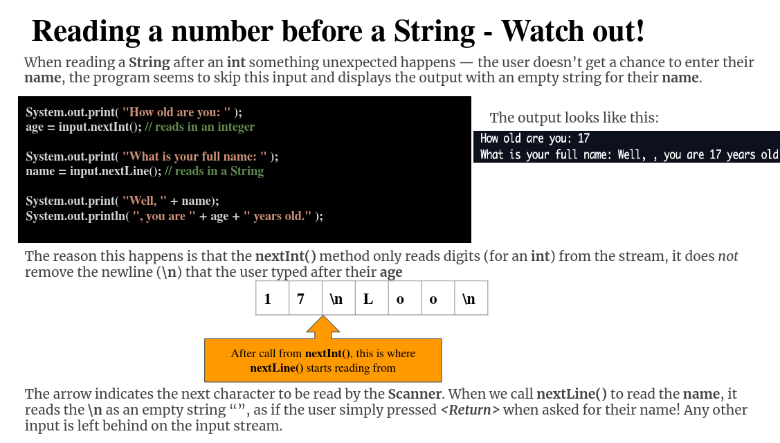 For some reason, nextInt() will not read in the escaped character newline. so, it leads to the next scan being a blank input.