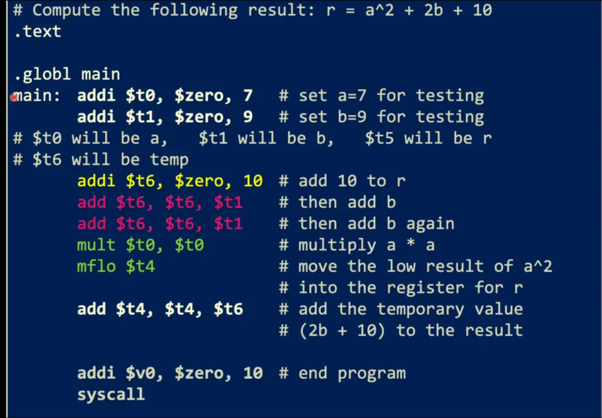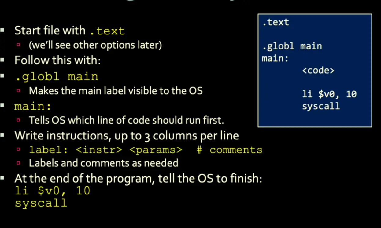 .datafor all values.textfor all assembly code.globl mainto make the main label visible to OSmain:to setup a main label- MIPS Assembly Instructions