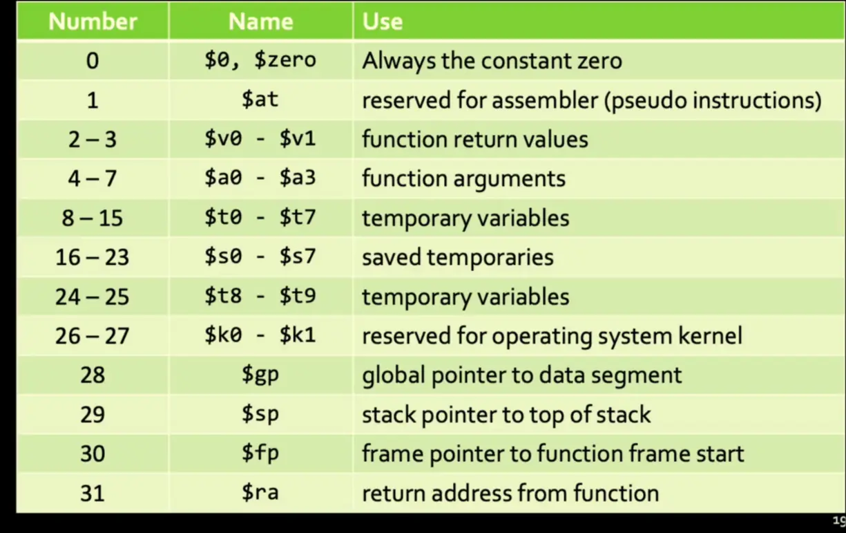 $zero: will always hold 0. All writes will be discarded$at: reserved for the assembler$gp: global pointer$sp: stack pointer$fp: frame pointer (like Base Pointer)$ra: return address$k0, $k1: reserved for the Kernel