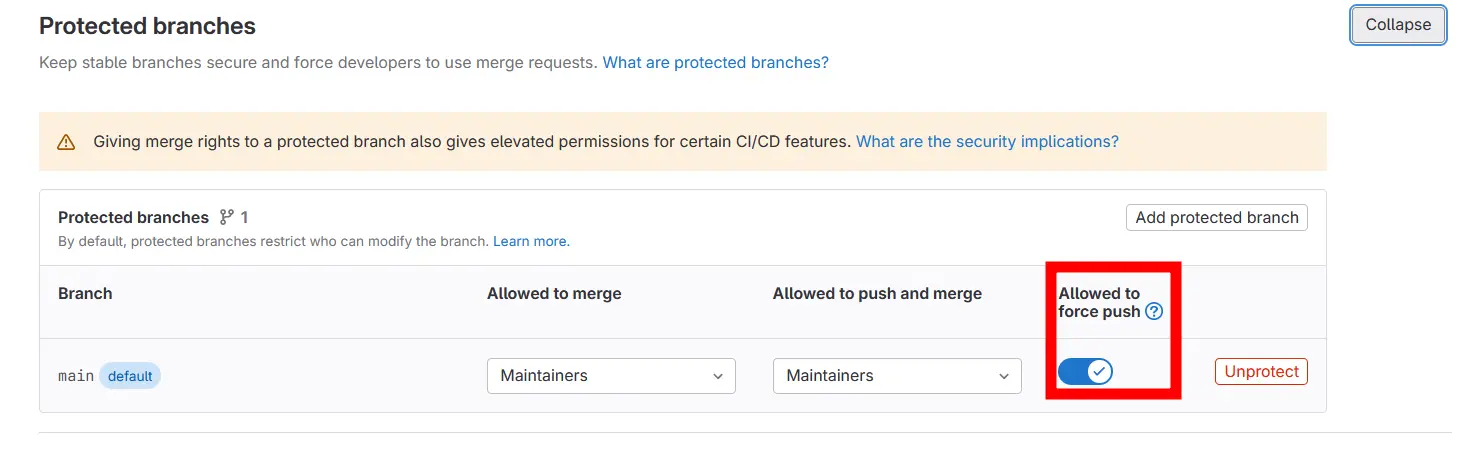 Protected Branches > Allow force push