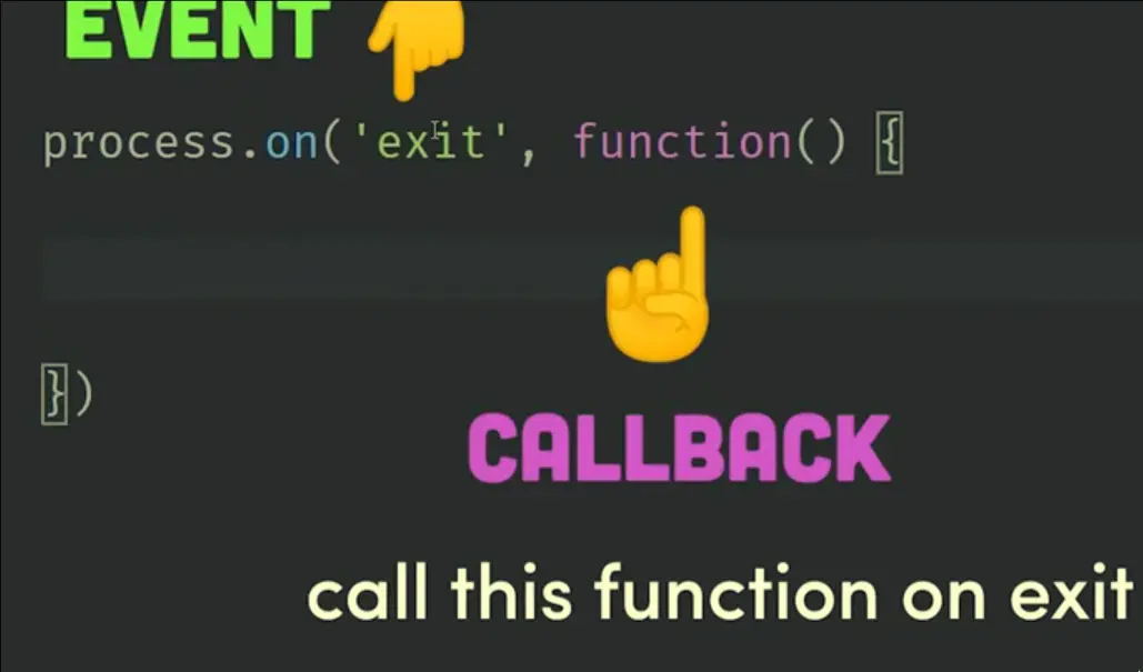 process.on('exit')This 'exit' in particular is saying that this event will fire before the process is about to exit.
