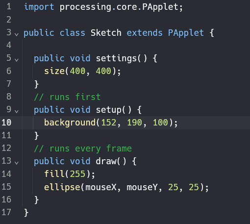 Processing(Java) clear() Processing(Java) dist() clear(). clears screen dist() Processing(Java) Other Objects Processing(Java) Images Processing(Java) Mouse