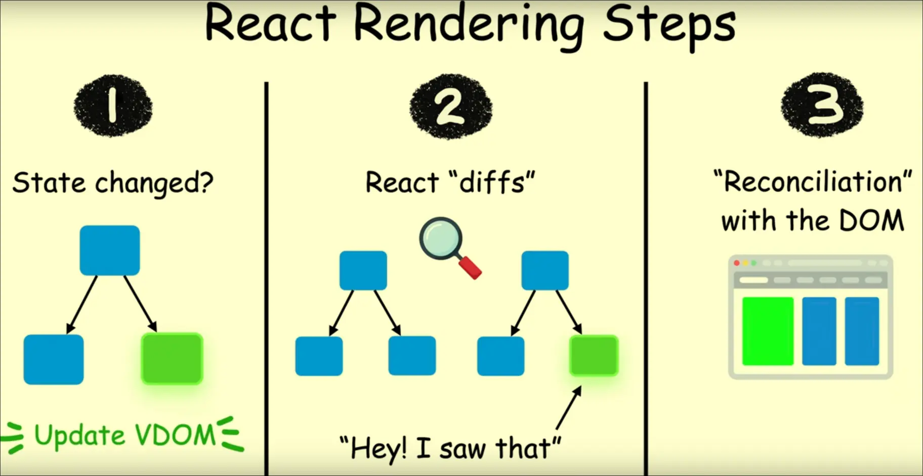 React rendering decisions come from VDOM Process If state is changed, then update VDOM “diff” the VDOM with the real DOM Once it sees the “diff”, if it exists, react updates the real DOM