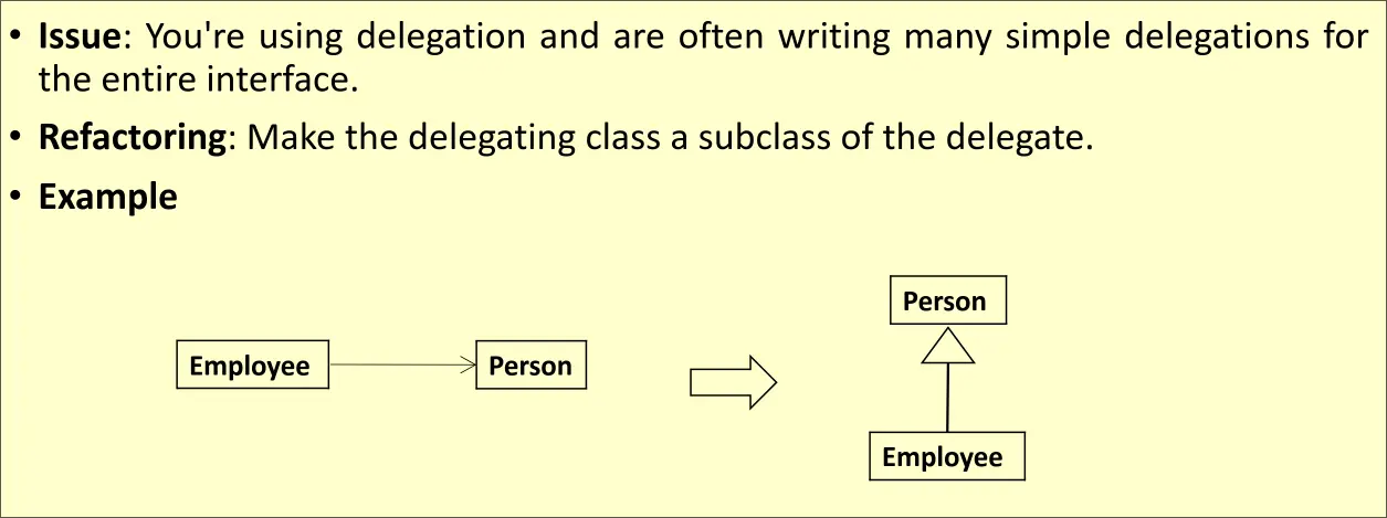 A form of Refactoring that involves converting a class that delegates another into a class that inherits the other.
