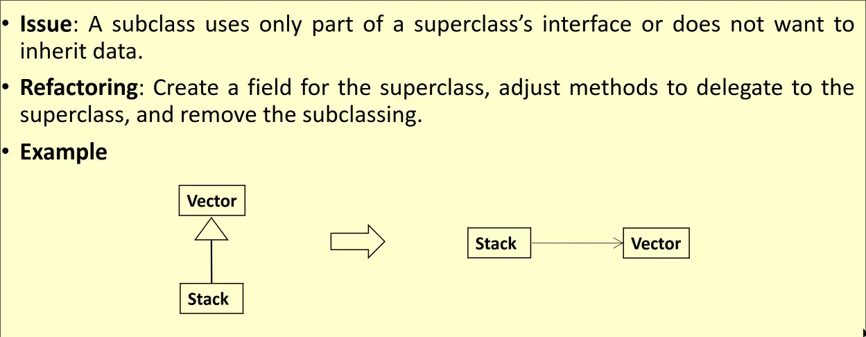 A form of Refactoring that involves replacing a direct inheritance of a superclass with a field of the superclass instead. Used when a subclass only uses part of the superclassâ interface.