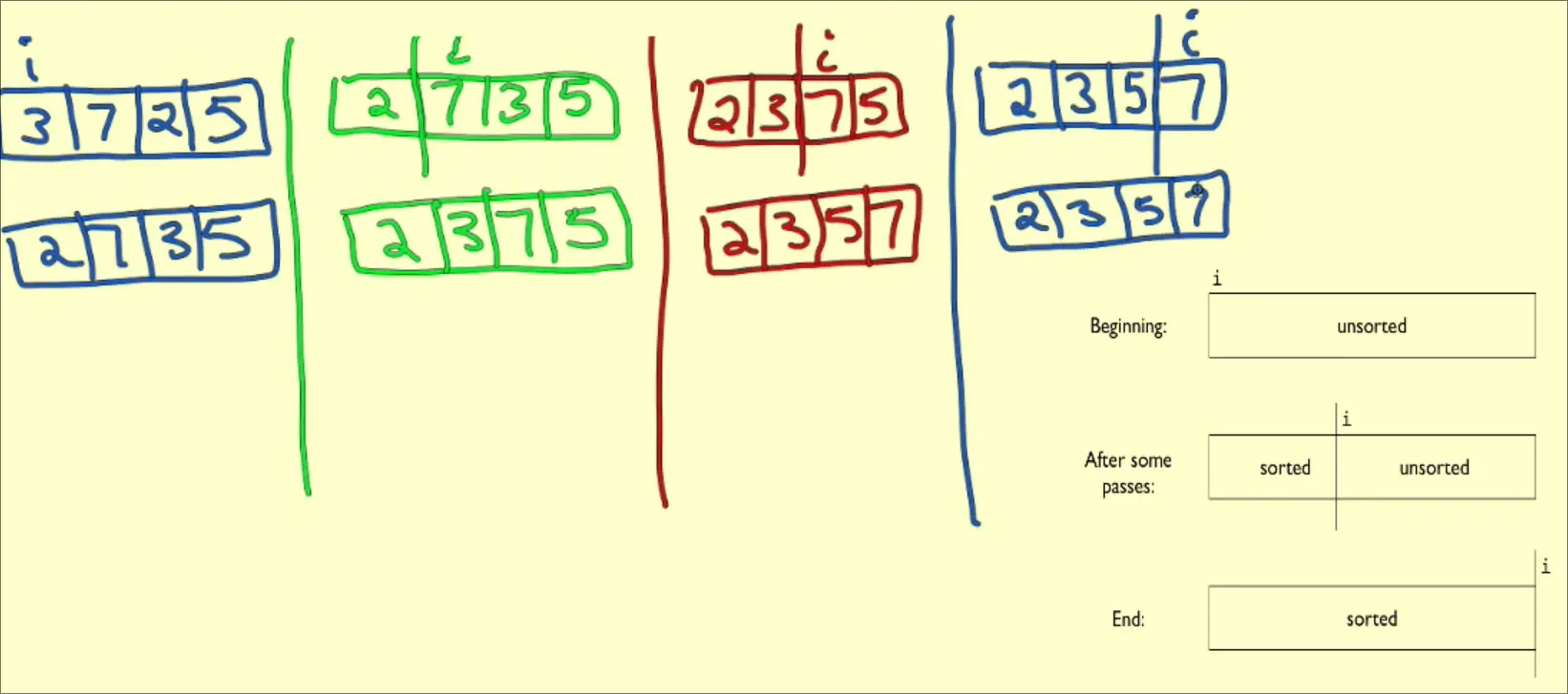 Search through the list until you find the smallest item, then move that smallest item to the start of the list. That start of the list is now the sorted section, and anything not sorted is to the right.