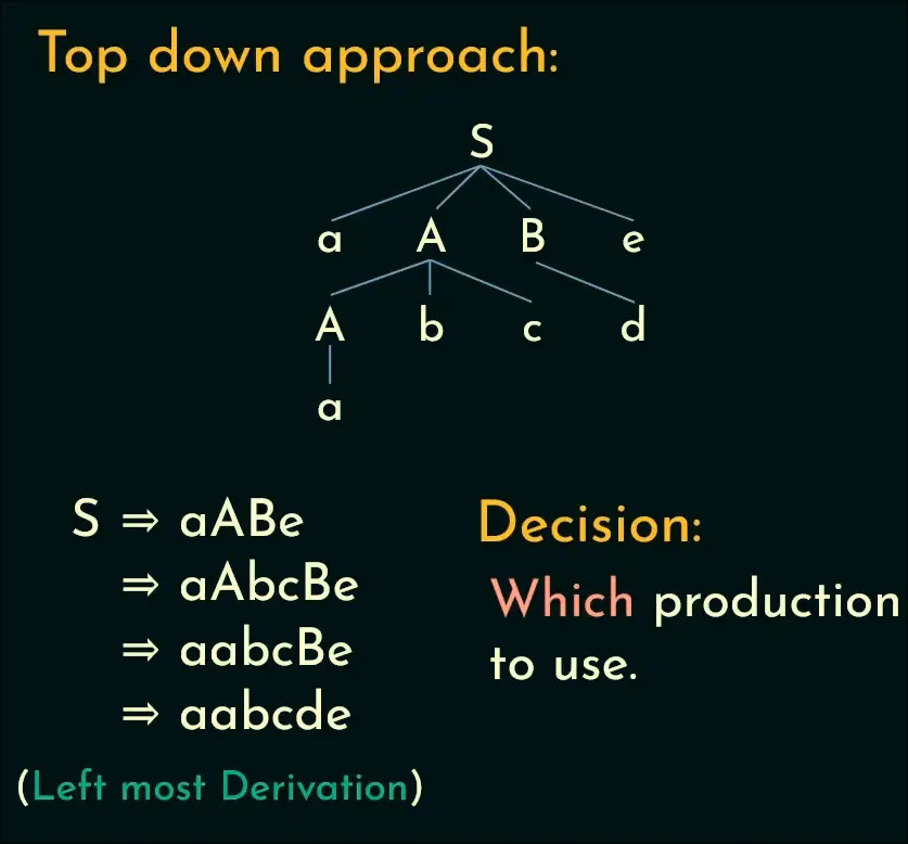Starting at a root node, and choosing Production to determine later derivations that match the input.