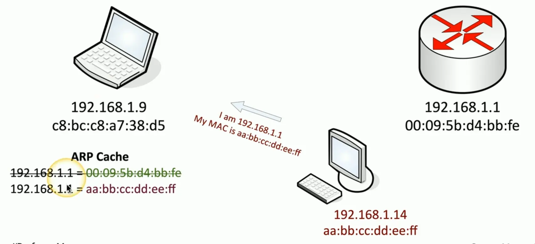 The attacker will then do the same attack to the router, thereby allowing the attacker device to sit between the traffic of the two devices.