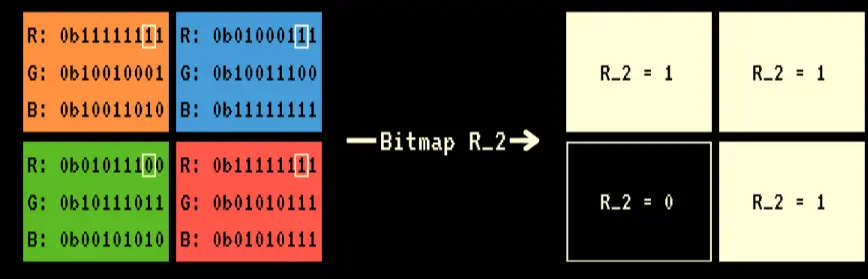 A image created from an original RGB image that is only the specific bit for a specific R,G or B channel.