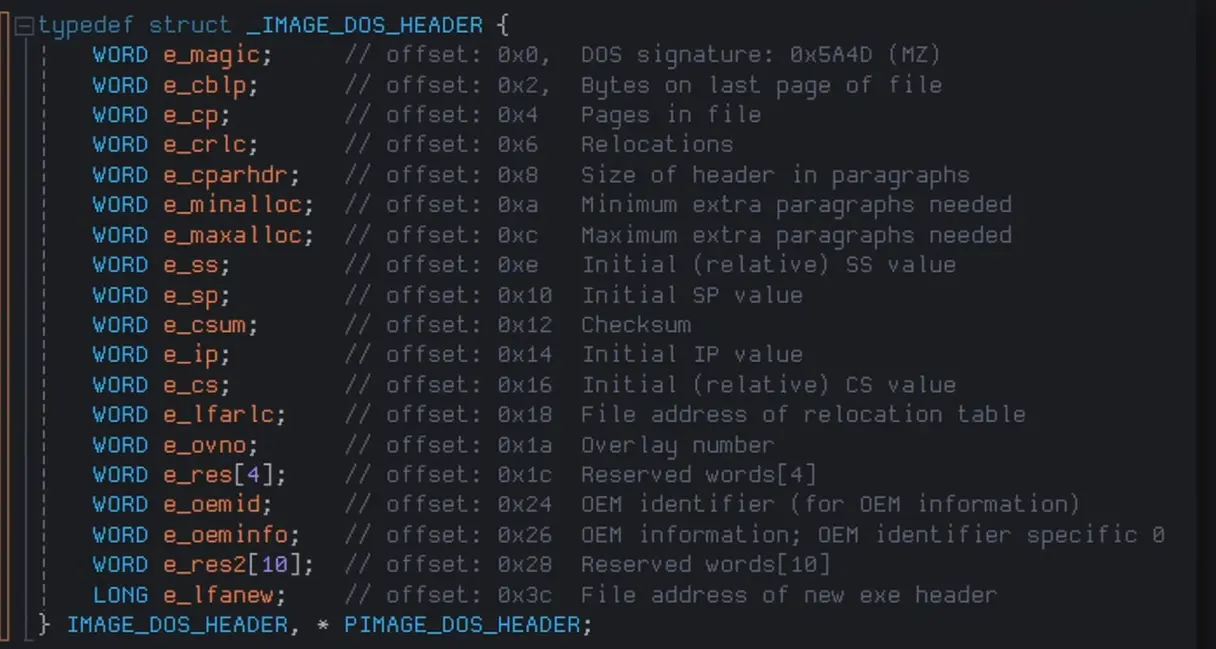 And it follows this 64 byte structure here: Important ones are: [Magic Numbers]. LFANEW - pointer to the NT Header