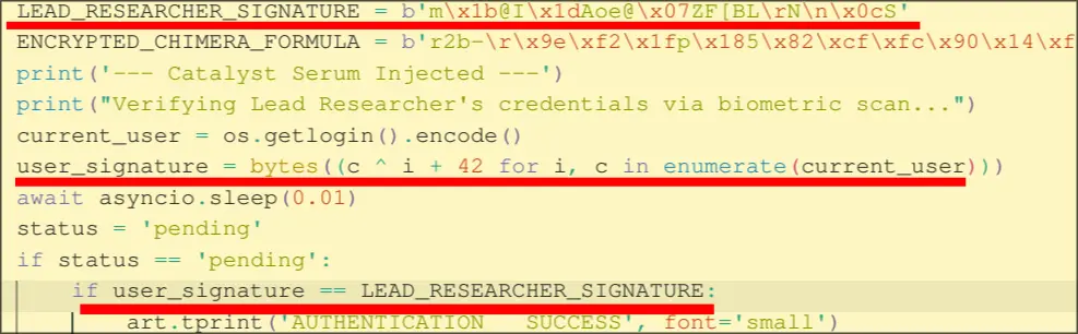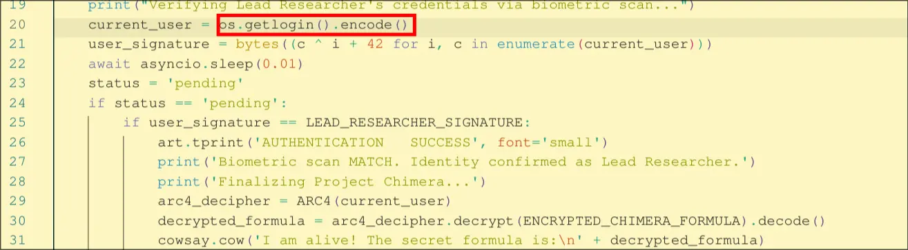 Our goal is now to find the current_user. We do this by reversing the user_signature. Which we know must be equal to LEAD_RESEARCHER_SIGNATURE.