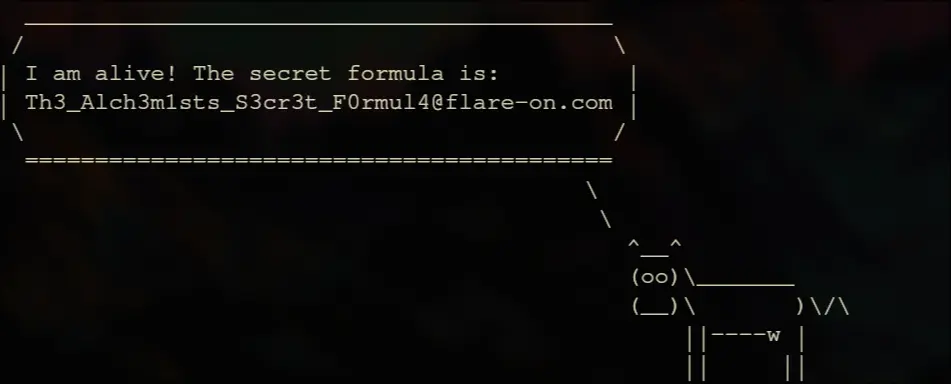 cowsay.cow('I am alive! The secret formula is:\n' + decrypted_formula)