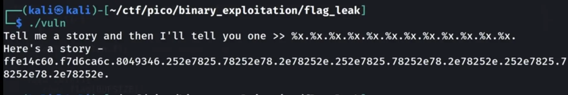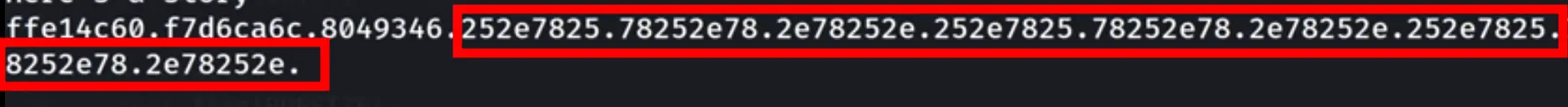Converting this from hex to ascii, we find that it reads: “%x.%x.%x.%x.%x.%x”. We have essentially put our string data on the stack aswell, thats why its printing it