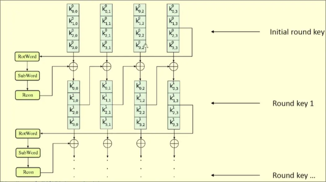The round key expansion is a recursive process.
