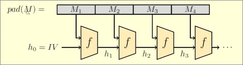 - Message blocks compressed one after another using a Compression Function to produce chaining variable that is used to compress