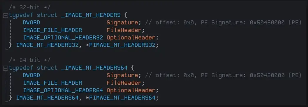 There are 2 versions of the NT Header The only difference is that in the 64bit structure is the Optional Header NT Header PE Signature File Header Optional Header