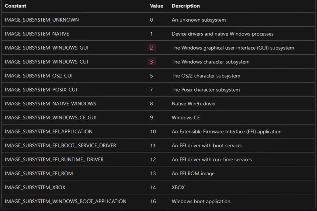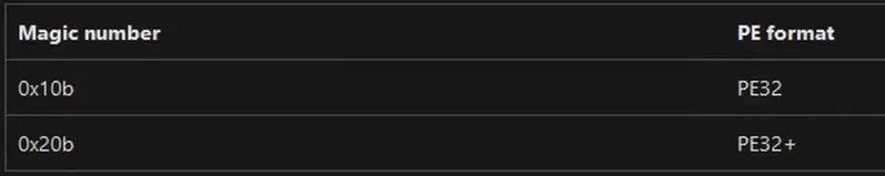 Tells us if its either PE32 or PE32+ ← which is PE64