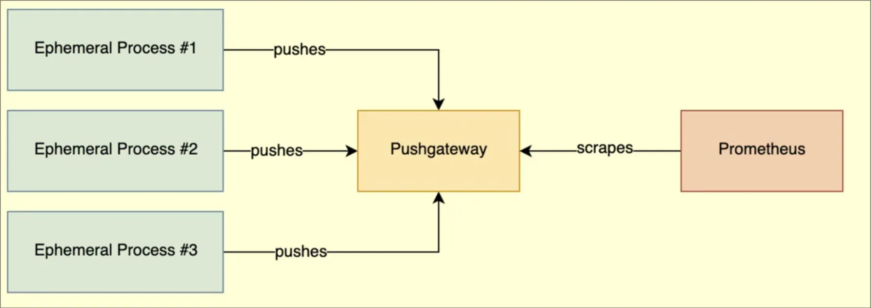 Processes push to a gateway, and prometheus scrapes from that gateway.