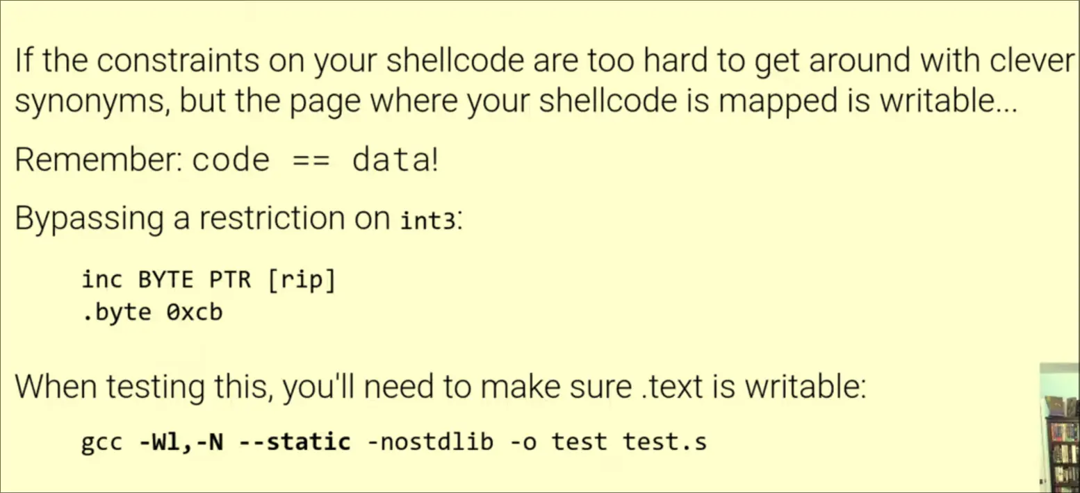 - Make your shellcode is writable and increment data values in there