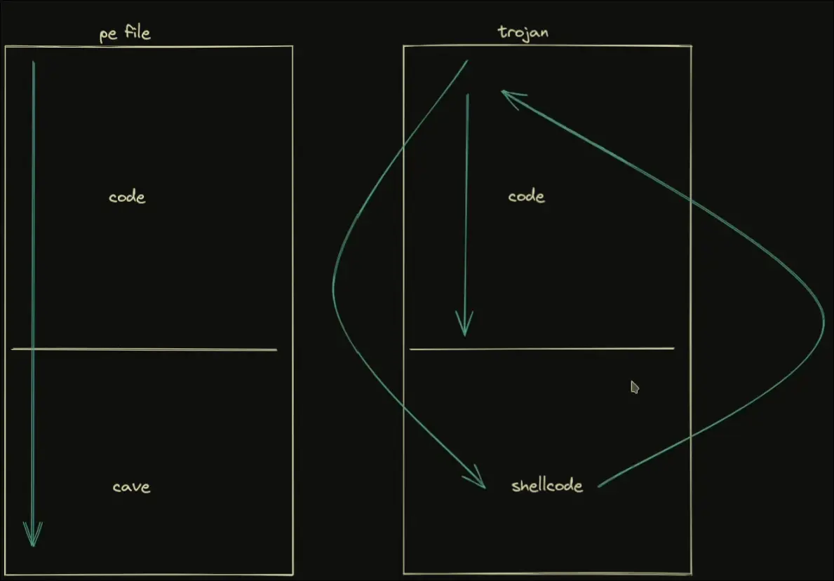 Trojan that follows the process of: First loading shellcode Returning back to program data and running from there